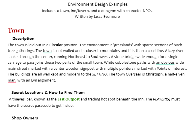 Environment and Item sheets consist breakdowns of a location, what consists within that space, characters inhabiting it, and items players can find.