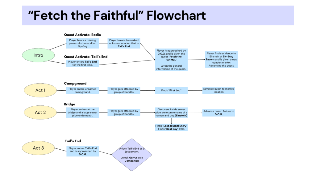 I developed a fan-created concept questline called “Fetch the Faithful” set in the world of Fallout 4, showcasing my ability to craft engaging narratives within an established IP. This project included detailed found narrative elements, characters, and environmental storytelling designed to immerse players in the lore.